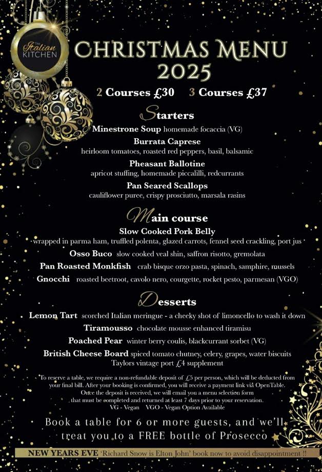 We hope you can join us for an Italian inspired celebration menu, complimentary Prosecco on arrival, a quirky quiz and tombola throughout the evening. There will be fireworks at midnight & sparklers for all guests. We've got live Elton John entertainment from Richard Snow on the piano, and all for only £65 per person.